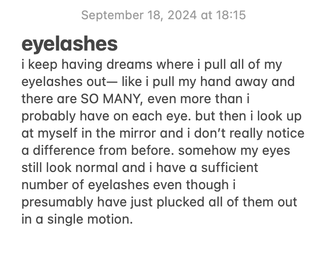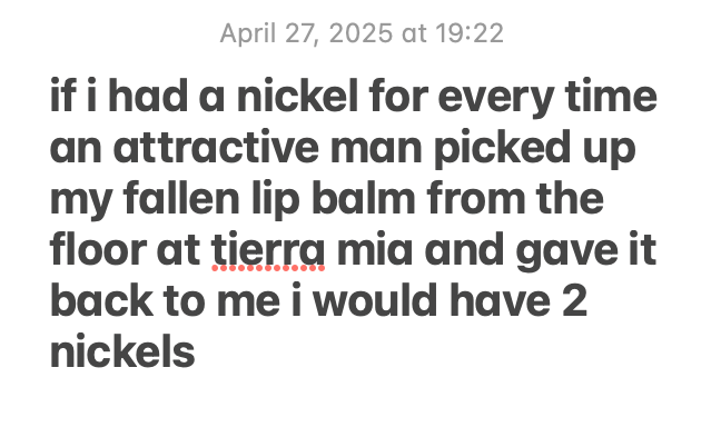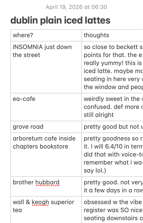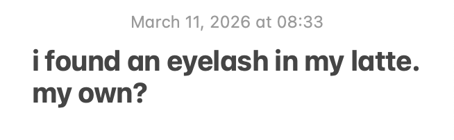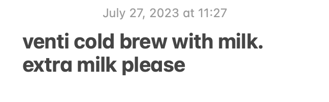 I imagine it was first used purely as a legitimate, no-frills notebook — passwords, addresses, what-have-you — and my own has a bit of that too, of course. To-do lists, gift ideas for friends’ birthdays, scans of documents and polaroid pictures. But, as most people my age would attest to, the vast majority of anyone’s Notes these days is taken up by extremely unnecessary entries. For me, it’s a lot of drive-thru coffee orders, logs of my dreams, memorable one-liners, and notes to pass to my friends if we’re somewhere too loud (or too quiet) to say them out loud…