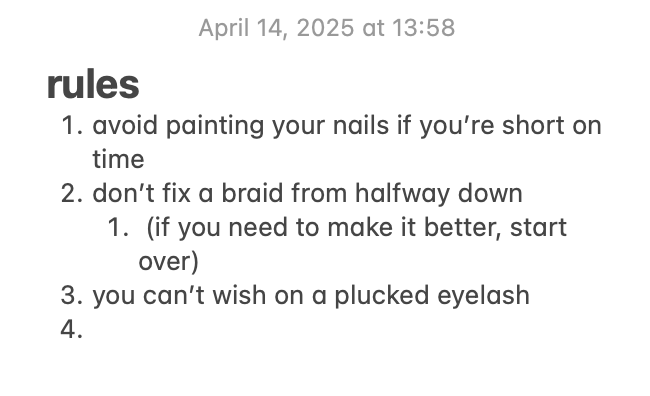 I have 1,694 entries in my Notes (somehow), and they take up 1.27GB of storage on my phone. That’s a lot. This selection of screenshots is not nearly all of them, or even the most exciting, I’m sad to say. But it is a fun little collage of notes/thoughts/numbered lists through time, and I hope it makes for a fun skimming experience.